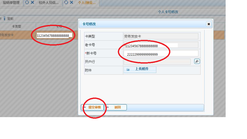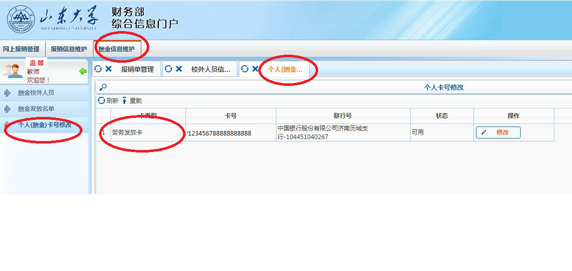 2、个人(酬金)卡号修改,点击界面下方“修改”键,即可对红色标注的账号和联行号进行修改。
